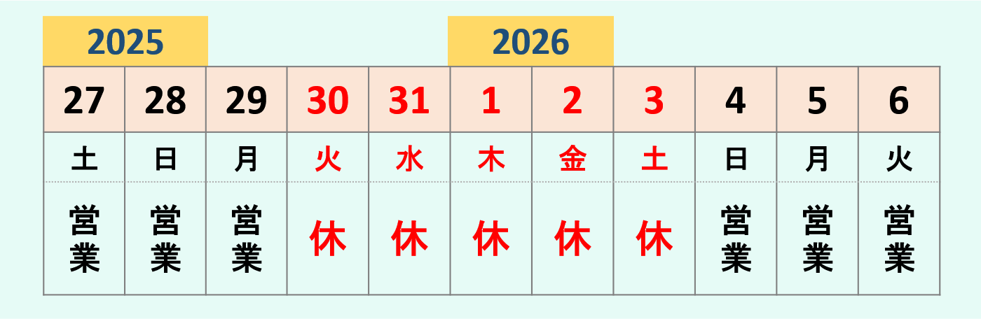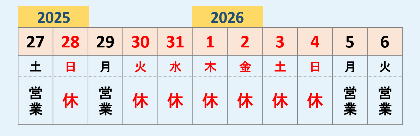 弊社では、誠に勝手ながら下記期間を年末年始休業とさせていただきます。